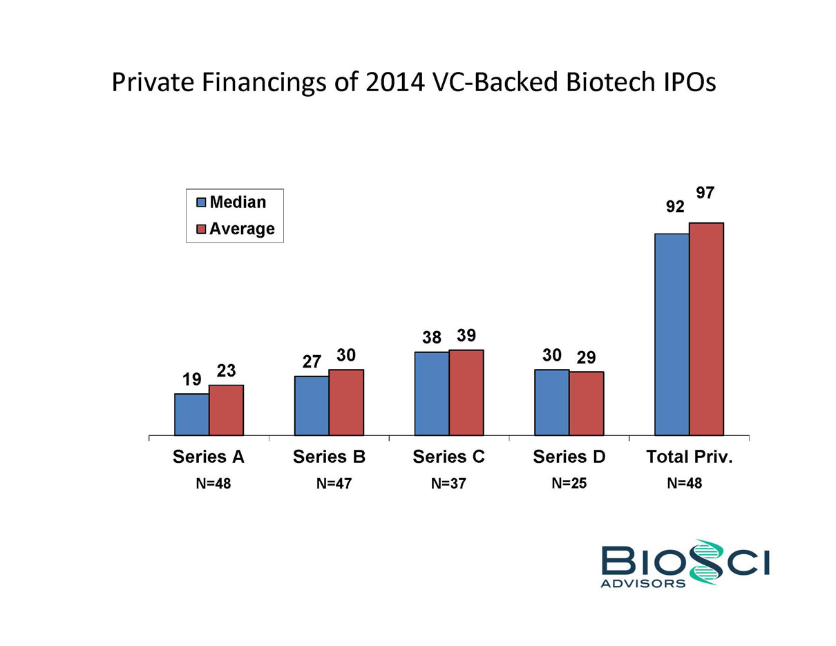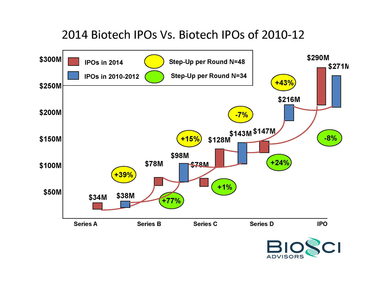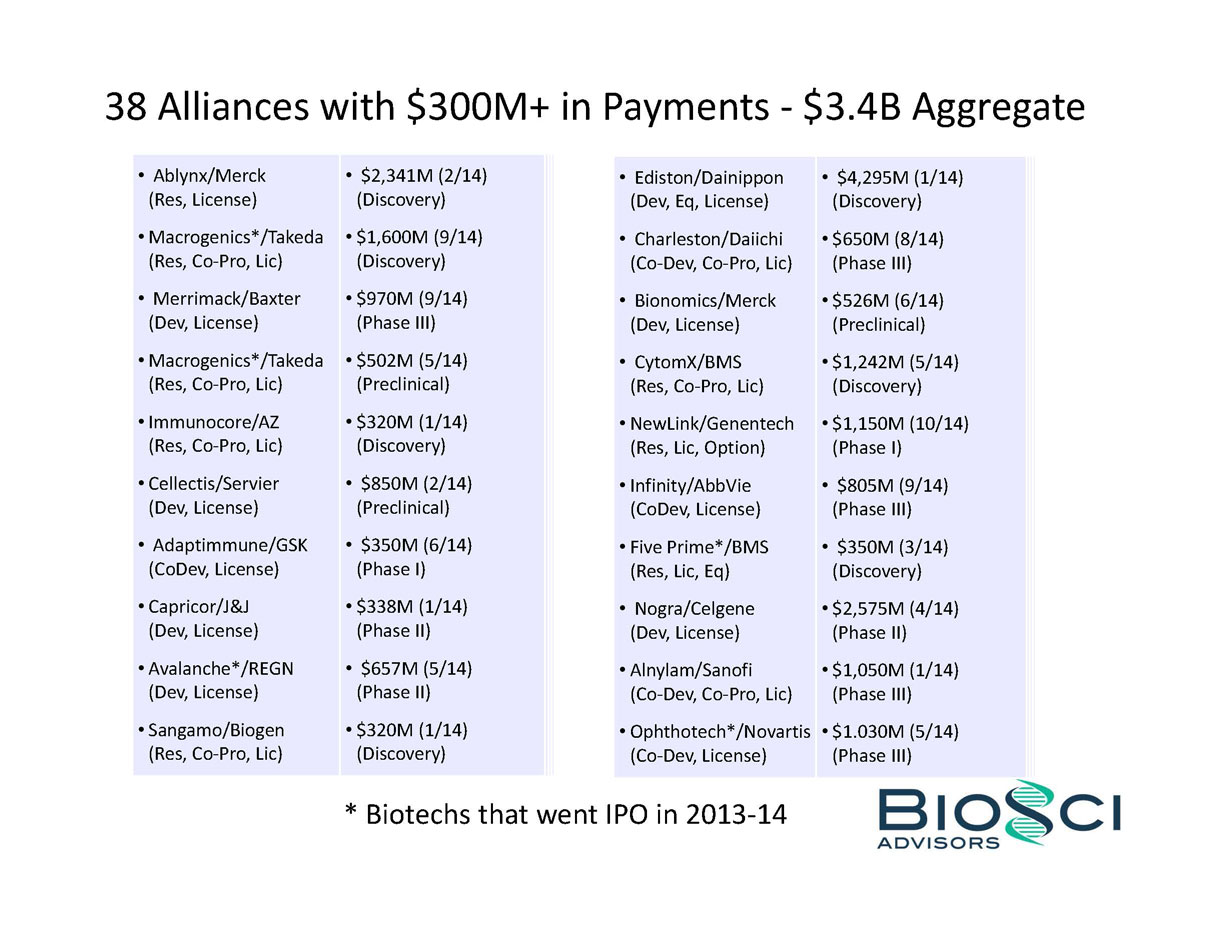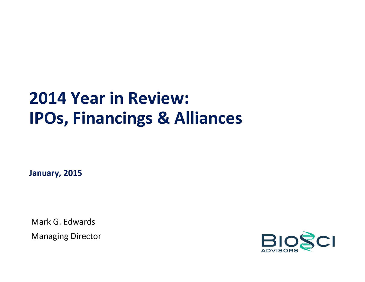 2014 was THE year of the biotech IPO. 82 companies raised an aggregate of $5.7 billion in US IPO proceeds, eclipsing the $2.7 billion raised in 2013, and even topping the previous industry high of $4.8 billion raised in 2000. But below the headlines, the “Class of 2014” was a study in contrasts – for example, 24 of these biotechs were seven years or less from founding to IPO, while the same number were 14 years or older. BioSci has analyzed the Class of 2014 by several of these contrasting attributes, including venture capital raised in pre-IPO financings. We also review recent trends in “Big Ticket” alliances.