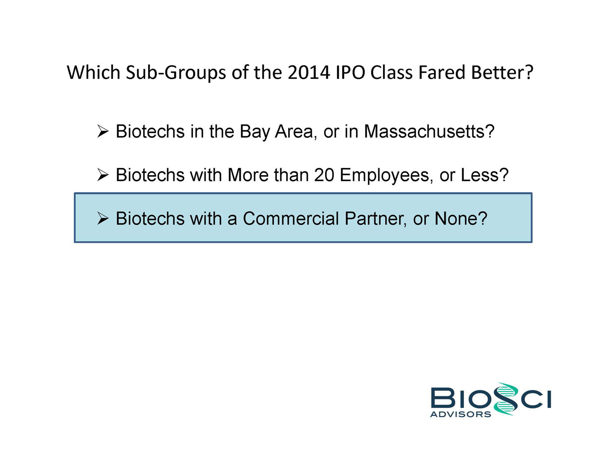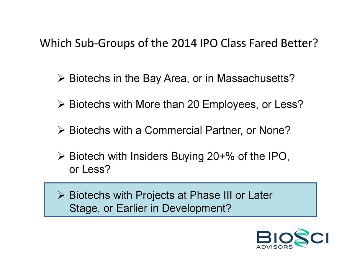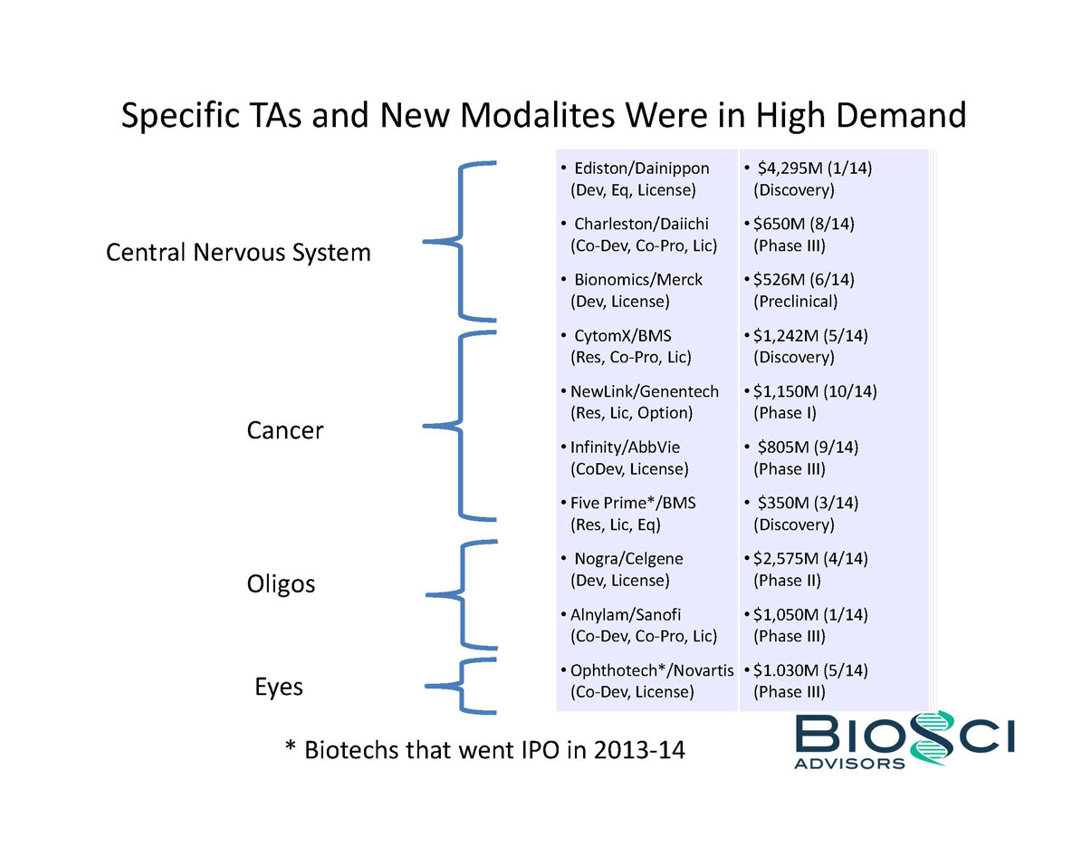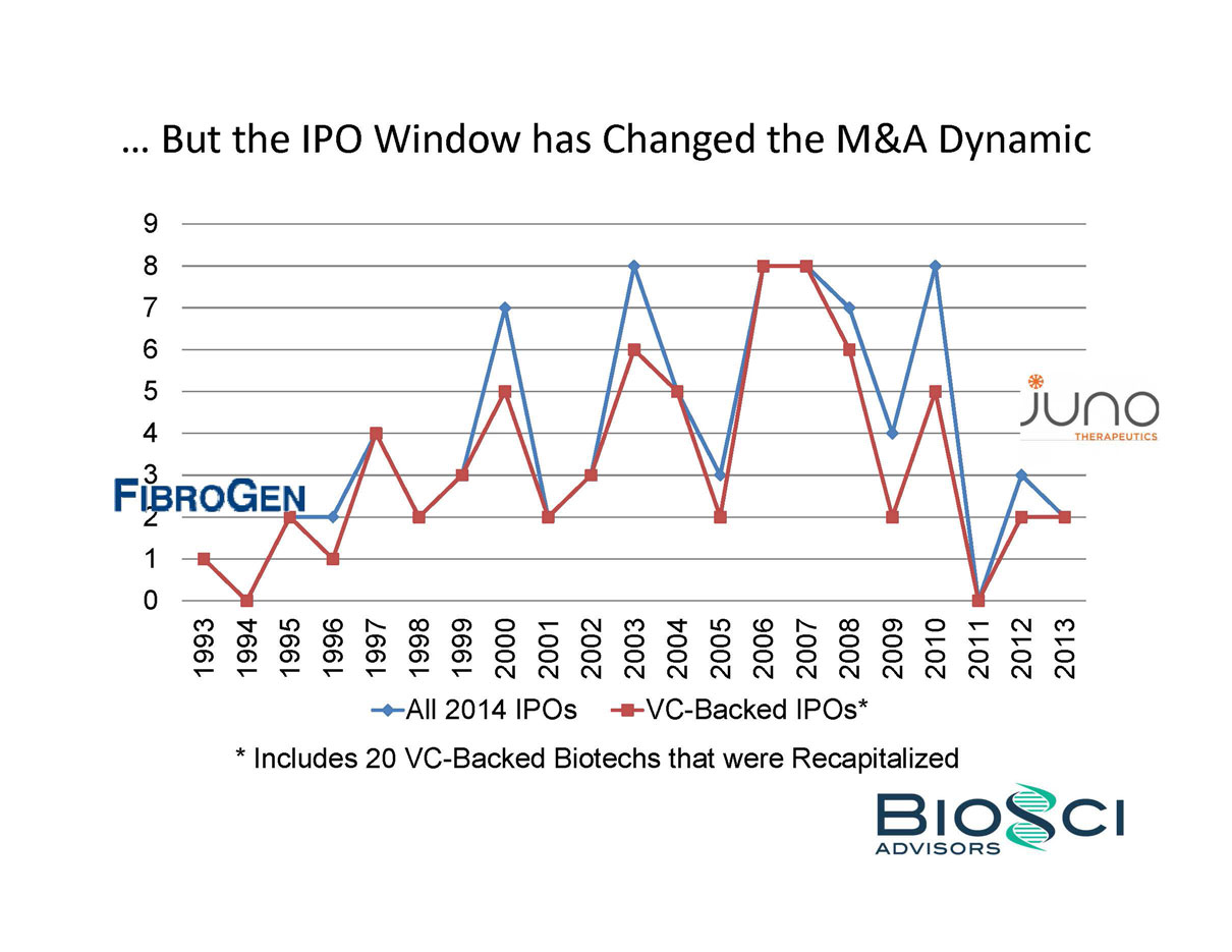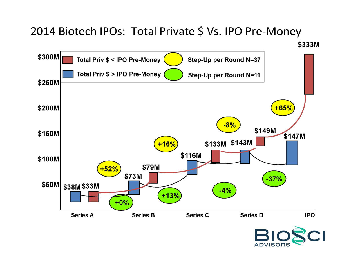 2014 was THE year of the biotech IPO. 82 companies raised an aggregate of $5.7 billion in US IPO proceeds, eclipsing the $2.7 billion raised in 2013, and even topping the previous industry high of $4.8 billion raised in 2000. But below the headlines, the “Class of 2014” was a study in contrasts – for example, 24 of these biotechs were seven years or less from founding to IPO, while the same number were 14 years or older. BioSci has analyzed the Class of 2014 by several of these contrasting attributes, including venture capital raised in pre-IPO financings. We also review recent trends in “Big Ticket” alliances.
