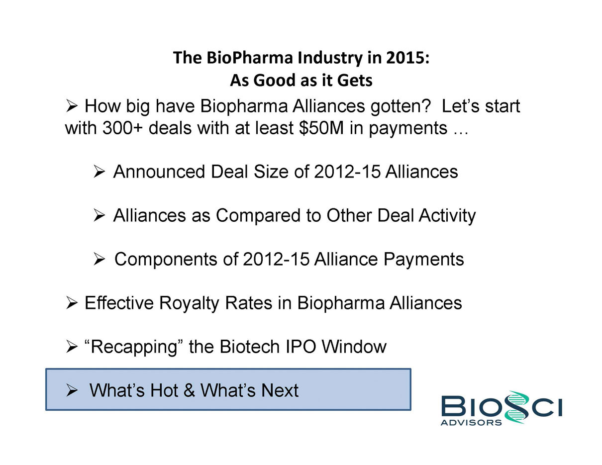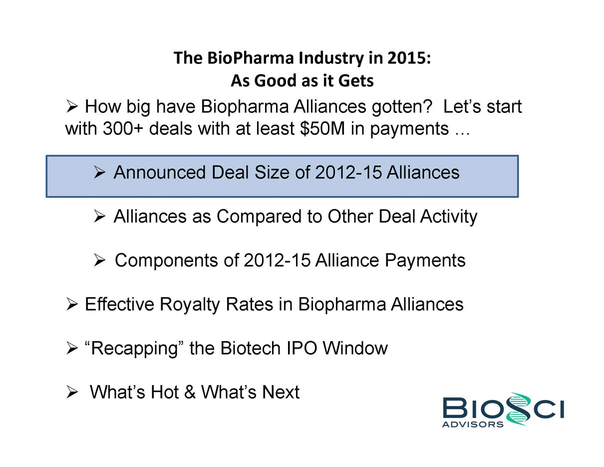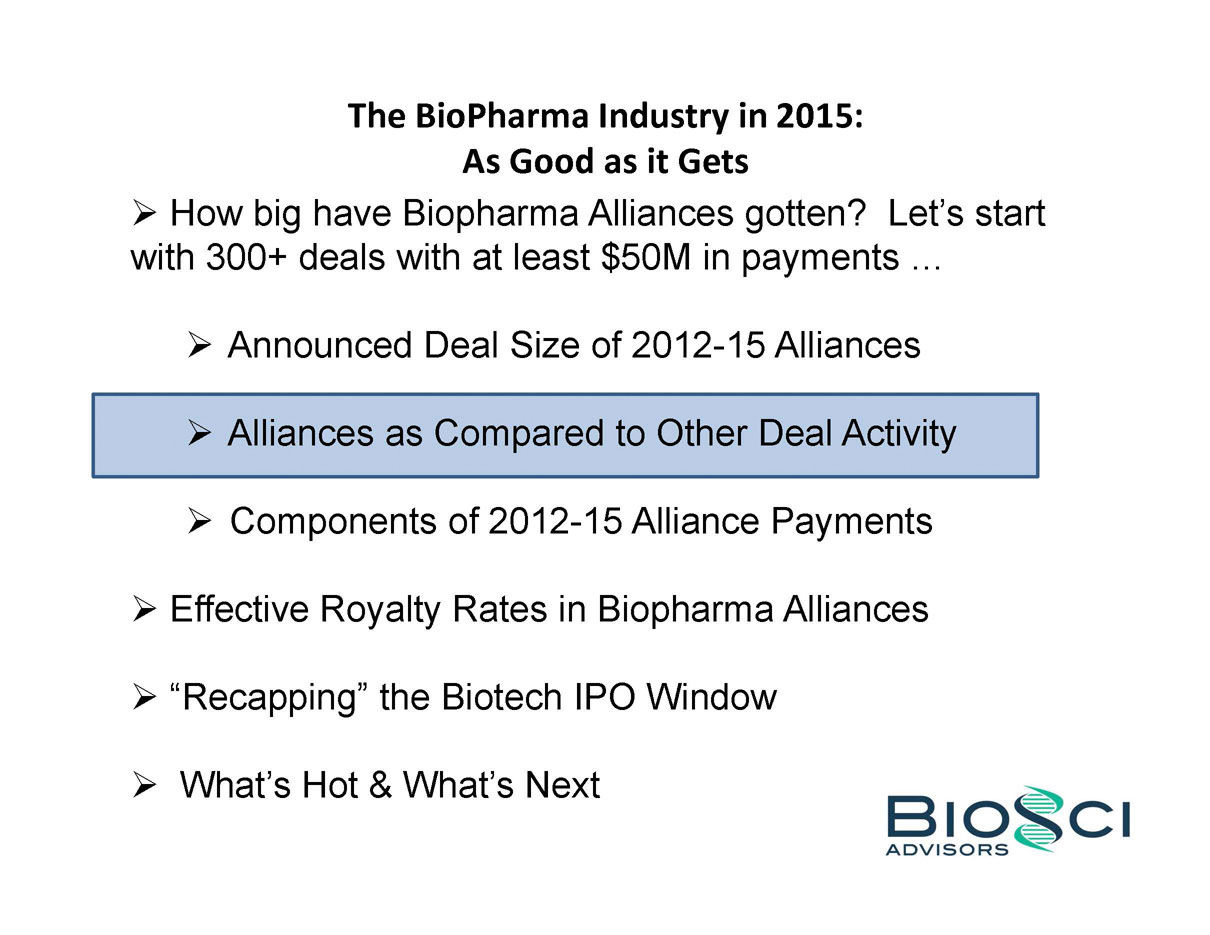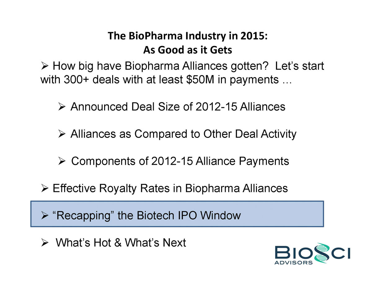 2015 has had a spectacular run: $145 billion in alliances with announced payments of $50 million or more from 2012-15, plus 375 acquisitions and asset purchases totaling more than $865 billion over the same period. Then there’s the 186 Initial Public Offerings on US exchanges since January 2013, raising $14 billion and constituting our longest “IPO window” by far. This presentation reviews what we’ve accomplished, and peaks around the curve at what may lie ahead.