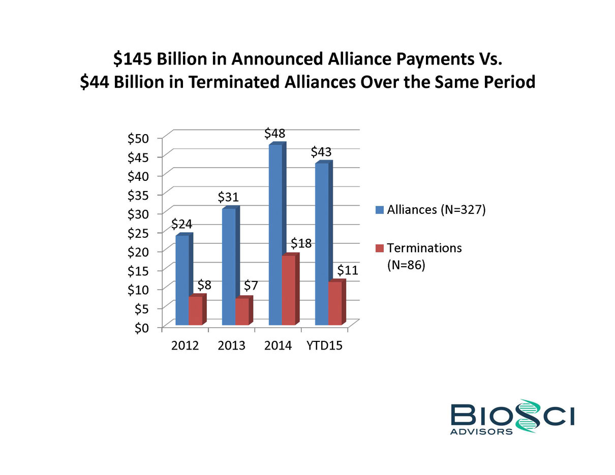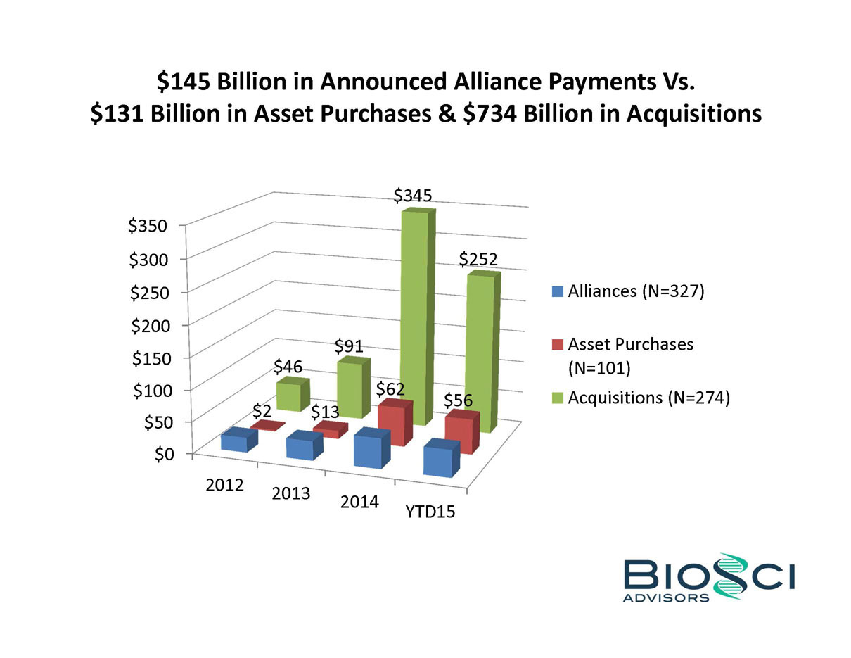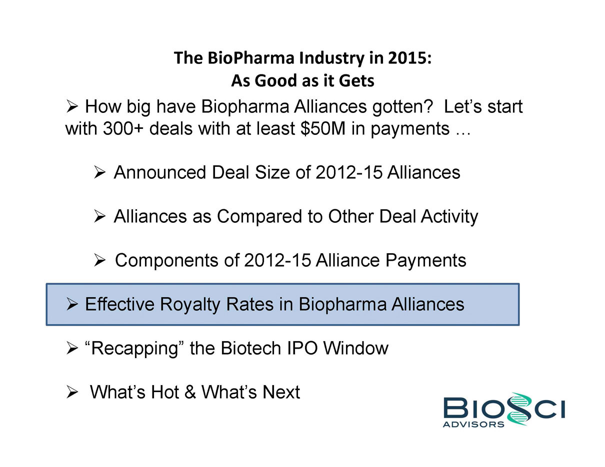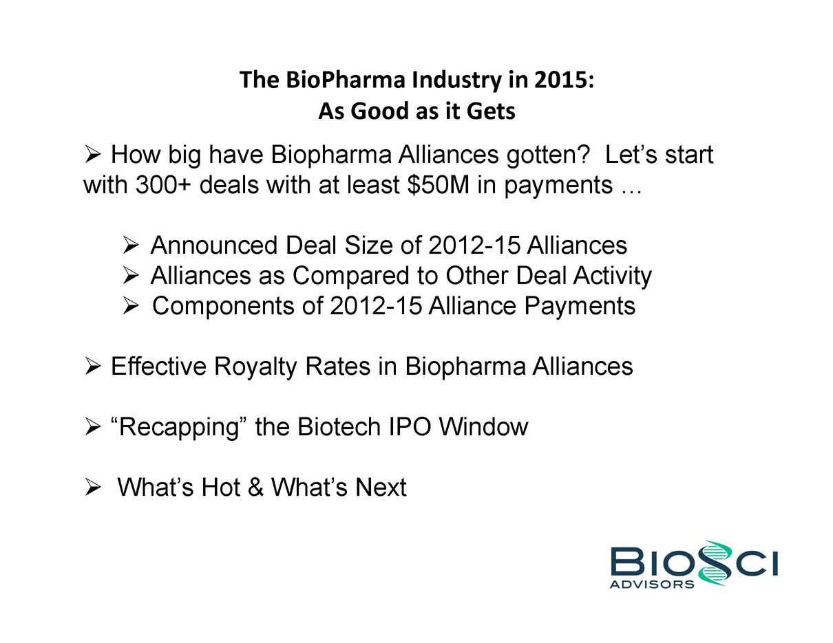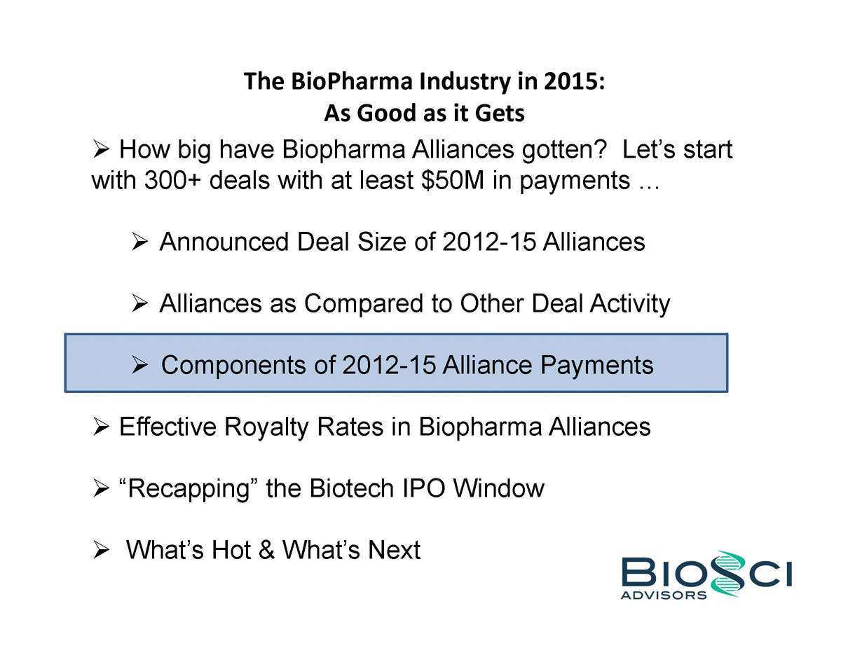 2015 has had a spectacular run: $145 billion in alliances with announced payments of $50 million or more from 2012-15, plus 375 acquisitions and asset purchases totaling more than $865 billion over the same period. Then there’s the 186 Initial Public Offerings on US exchanges since January 2013, raising $14 billion and constituting our longest “IPO window” by far. This presentation reviews what we’ve accomplished, and peaks around the curve at what may lie ahead.