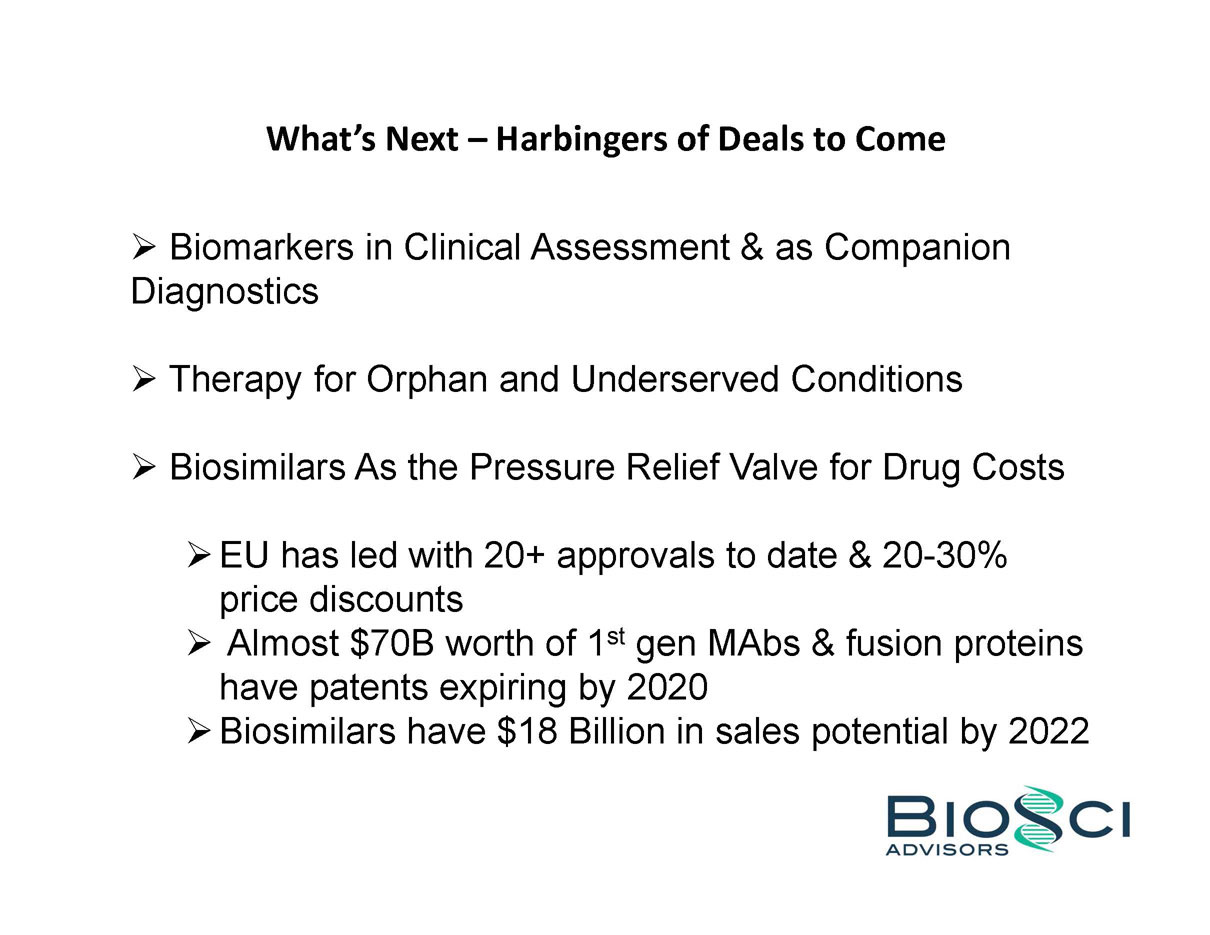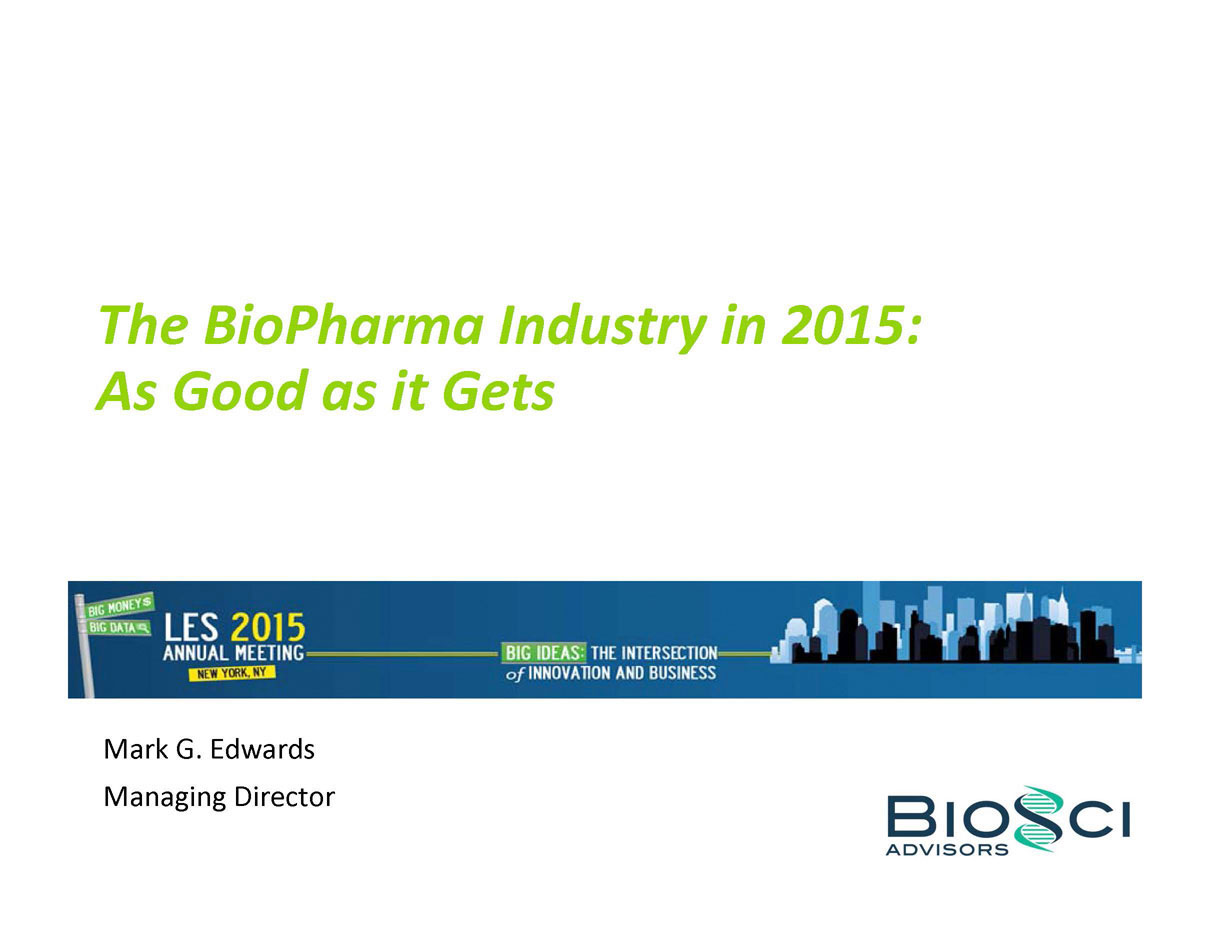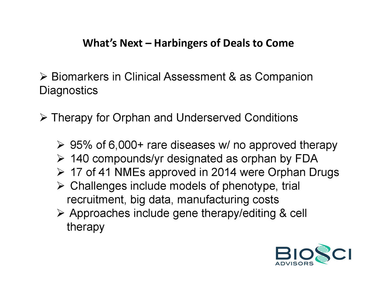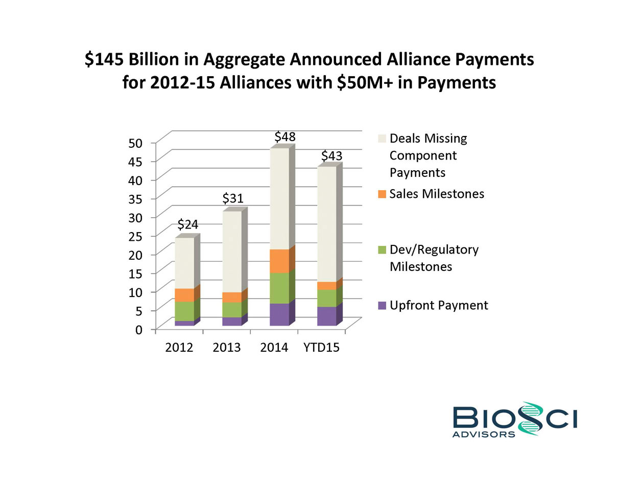 2015 has had a spectacular run: $145 billion in alliances with announced payments of $50 million or more from 2012-15, plus 375 acquisitions and asset purchases totaling more than $865 billion over the same period. Then there’s the 186 Initial Public Offerings on US exchanges since January 2013, raising $14 billion and constituting our longest “IPO window” by far. This presentation reviews what we’ve accomplished, and peaks around the curve at what may lie ahead.