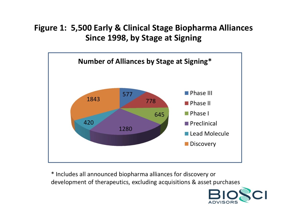 In all, we classified approximately 5,500 biopharma alliances by stage of development at deal signing. As shown in Figure 1 and the All Alliances spreadsheet accompanying this article, 36% of the total alliance dataset were clinical stage deals at signing: 577 alliances (10%) were Phase III stage, 778 (14%) were Phase II stage and 645 (12%) were Phase I stage. Discovery stage alliances were the largest single component of the dataset with 1,843 deals (33%), followed by Preclinical stage deals with 1,280 alliances (23%). 420 alliances (8%) involved Lead stage molecules at signing.
