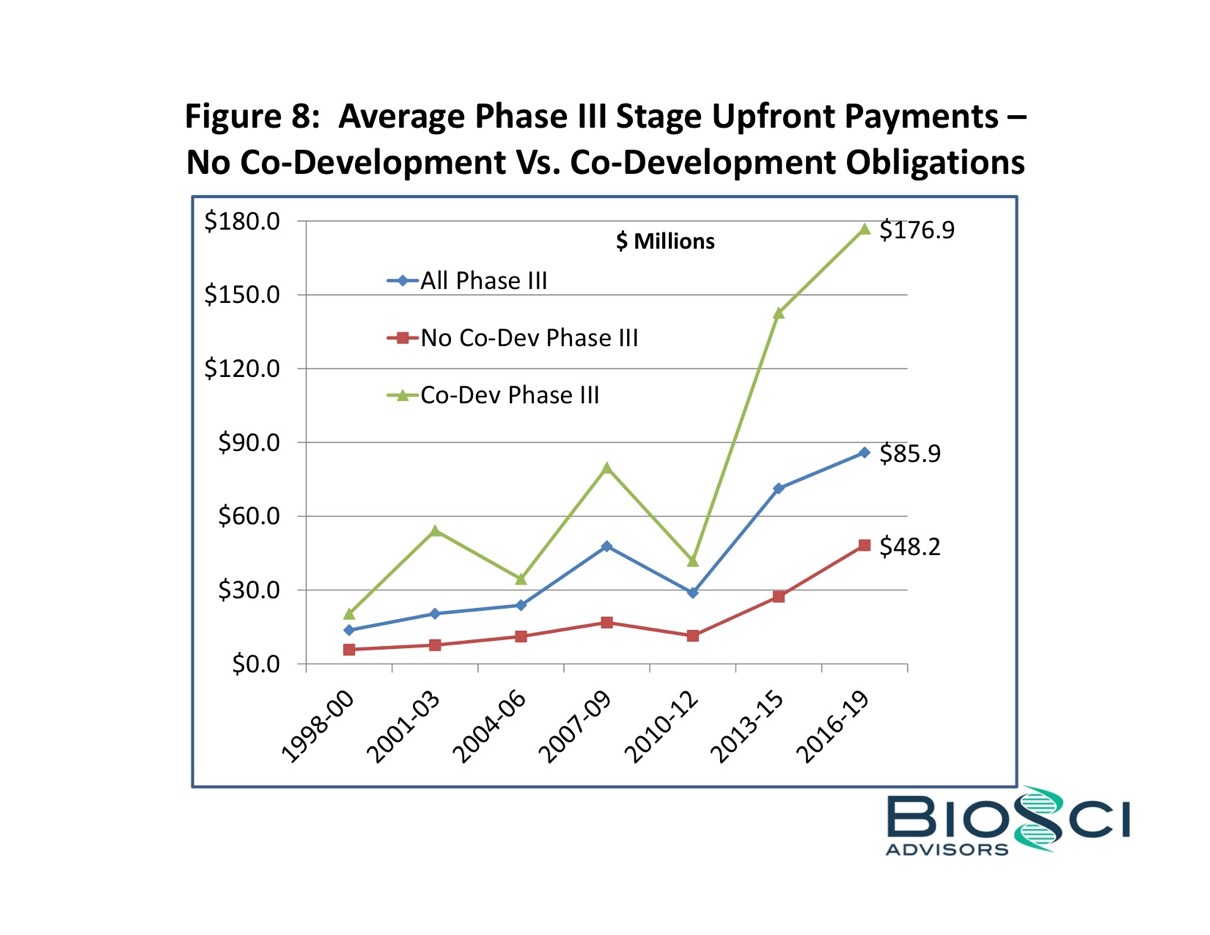 Six months ago, BioSci undertook a comparative analysis of two decades of development and regulatory (Dev/Reg) milestone payments in biopharma alliances. This analysis showed that average total Dev/Reg milestone payment terms have increased 2-3 fold across all stages of development at deal signing. We argued that Dev/Reg milestone payments matter enormously in alliance value allocation between licensor and licensee precisely because most biopharma alliances don’t result in commercial products. We also suggested that conceptually it’s useful to view Dev/Reg milestone payments as upfront payments that are escrowed by the R&D program’s licensee until achievement of the associated milestone event, and are then released to the program’s licensor.