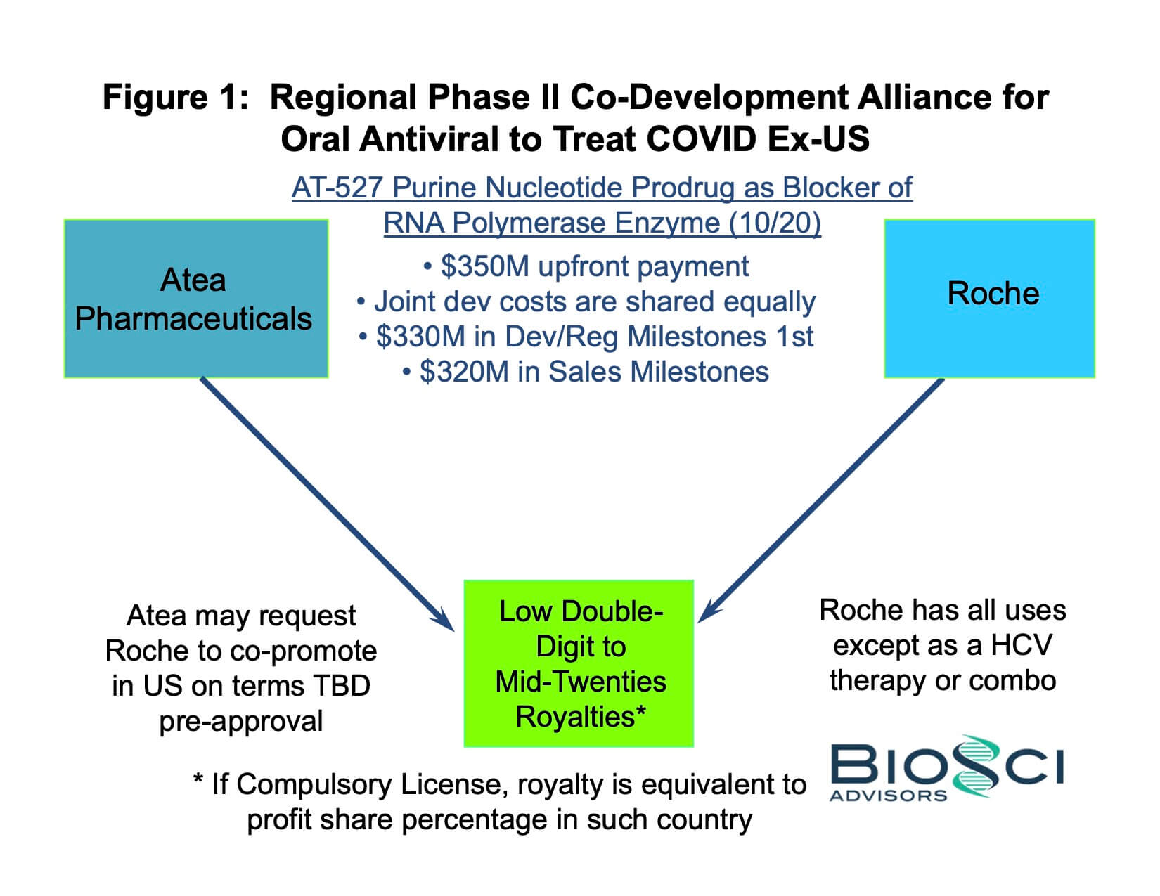 An example is shown in Figure 1, a snapshot of the recently announced alliance between Atea Pharmaceuticals and Roche for the ex-US commercialization of AT-527, Atea’s Phase II anti-viral for the treatment of Covid-19. In this instance, double-digit royalties might be replaced by substantially less sales-related compensation in the event that Roche enters into one or more compulsory licenses for AT-527.