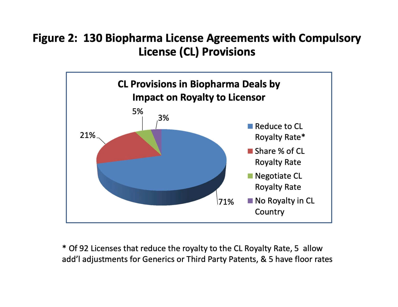 As shown in Figure 2 and the CL Provisions spreadsheet accompanying this article, 71% (92 deals) of CL provisions reduce the royalty paid to the licensor to the CL royalty rate. Of these instances, 5 deals allow additional royalty reductions for Generics or Third Party Patent royalties, and 5 deals provide a floor royalty, notwithstanding the CL royalty rate.