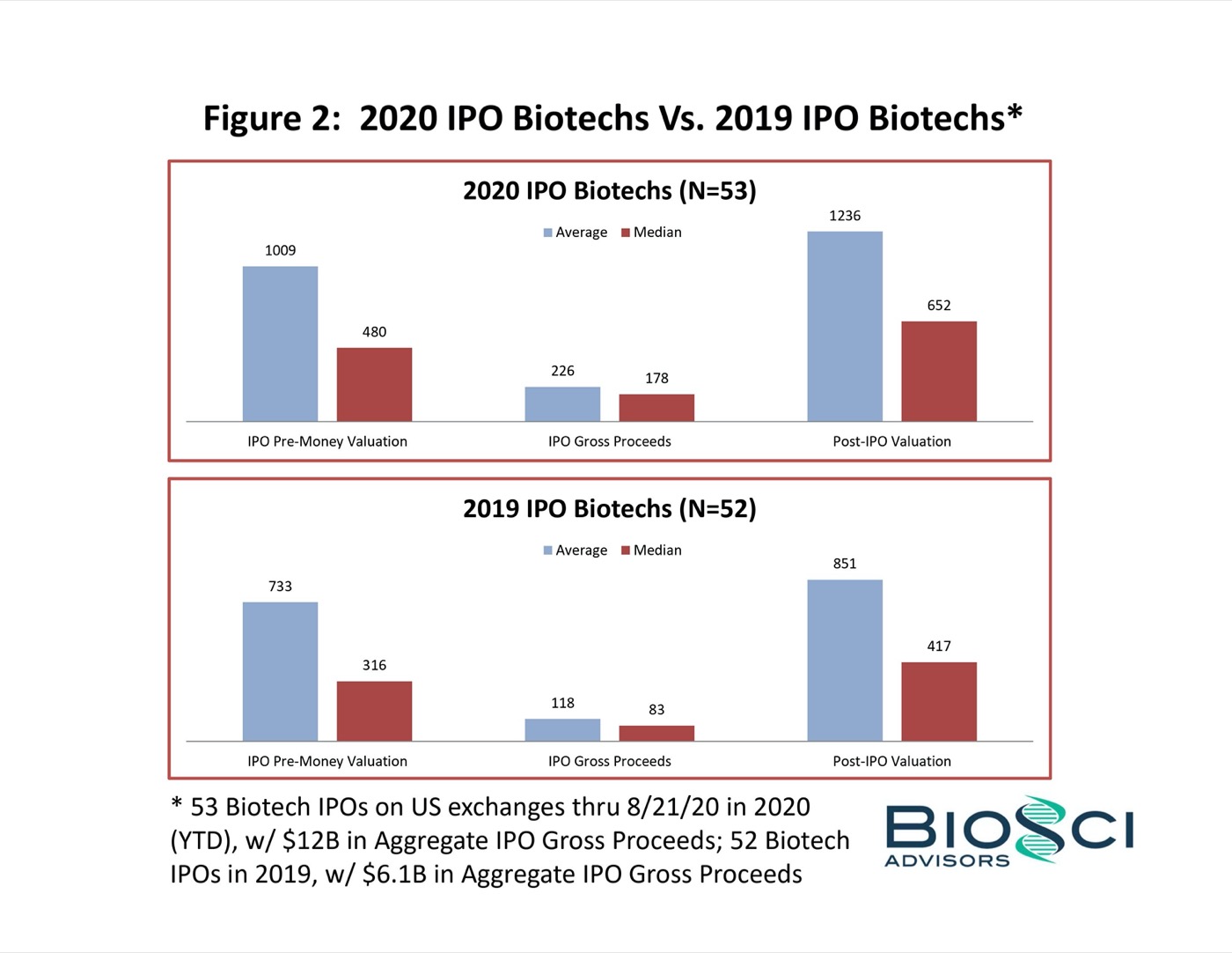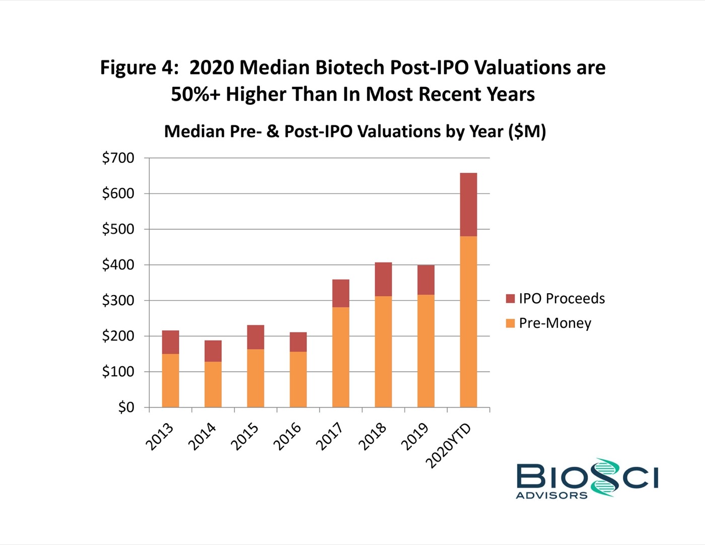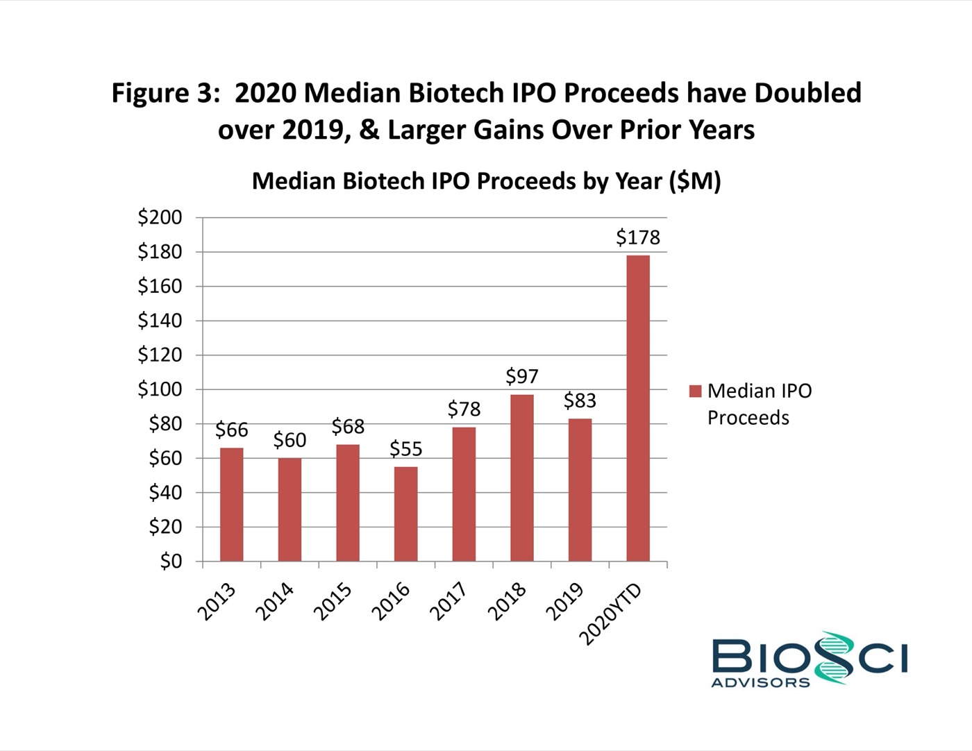 As shown in Figures 1 & 2, the 53 biotech IPOs on US exchanges year-to-date (YTD) have just surpassed all of 2019 in quantity, and have roughly doubled the aggregate amount raised last year. Even more impressive is that the median IPO proceeds of $178M per IPO are more than double the highest level seen in prior years (Figure 3), and the median post-IPO market capitalization of $658M per biotech is 50+% higher than previously seen (Figure 4).