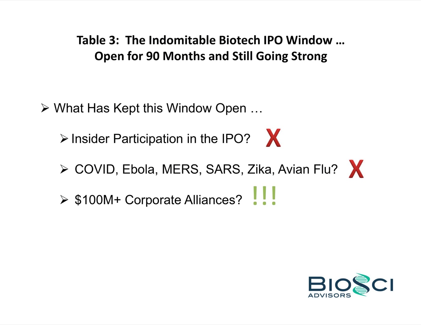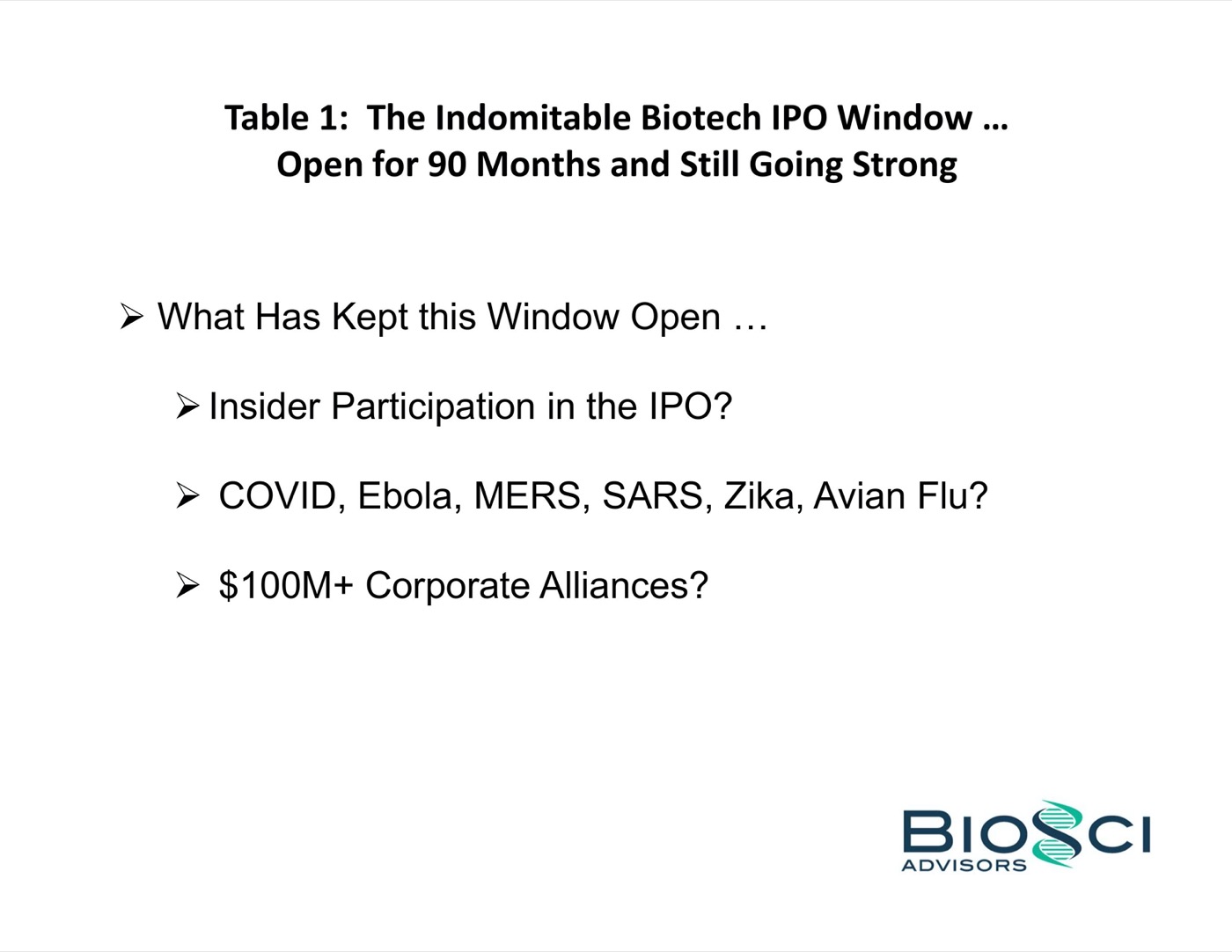 To understand what is keeping this IPO window open, we took a look back at the approximately 450 companies that have successfully gone public since January 2013. As listed in Table 1, we tested three hypotheses: (1) Insider participations in IPOs are motivating bankers with outsized transaction fees; (2) Public concerns with infectious diseases, most recently the Covid-19 pandemic, are provoking a flurry of new entrants in these areas; and (3) Substantial collaborations ($100M+ corporate alliances) and acquisitions are providing sustained resources to augment product development & commercialization.