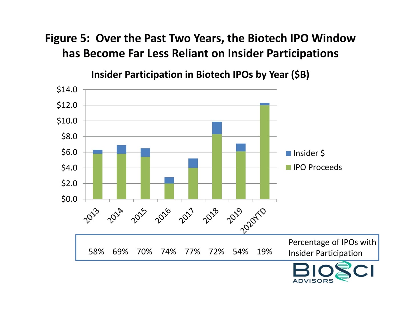 In January of 2018 we published an article entitled “The Best Biotech IPO Window … that Money Can Buy.” This analysis suggested that the prevalence of insider participations in biotech IPOs might well account for the longevity of the biotech IPO window, then entering its sixth year. However, as shown in Figure 5, over the past two years biotech IPOs have become far less reliant on insider participations. For IPOs in 2020, for example, only 10 of 53 offerings had insider participations, and these accounted for only $300M of roughly $12B in aggregate IPO proceeds.