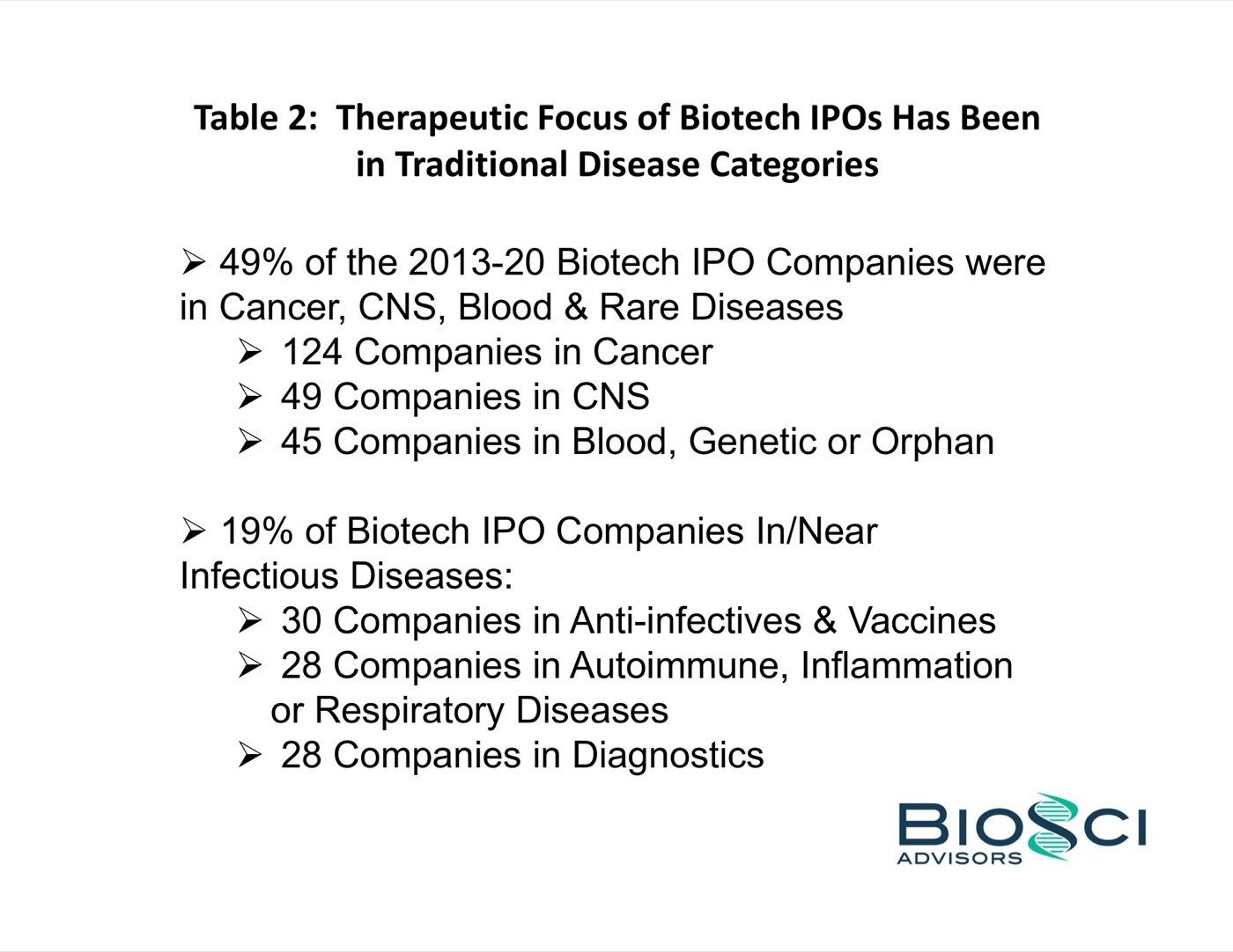 30 biotechs (7%) were primarily focused on anti-infectives at the time of IPO. If one adds those companies in autoimmune, inflammatory and respiratory diseases, any of which might easily pivot to infectious diseases, plus 28 diagnostic companies, that still only accounts for 19% of the total 2013-20 IPO Class.