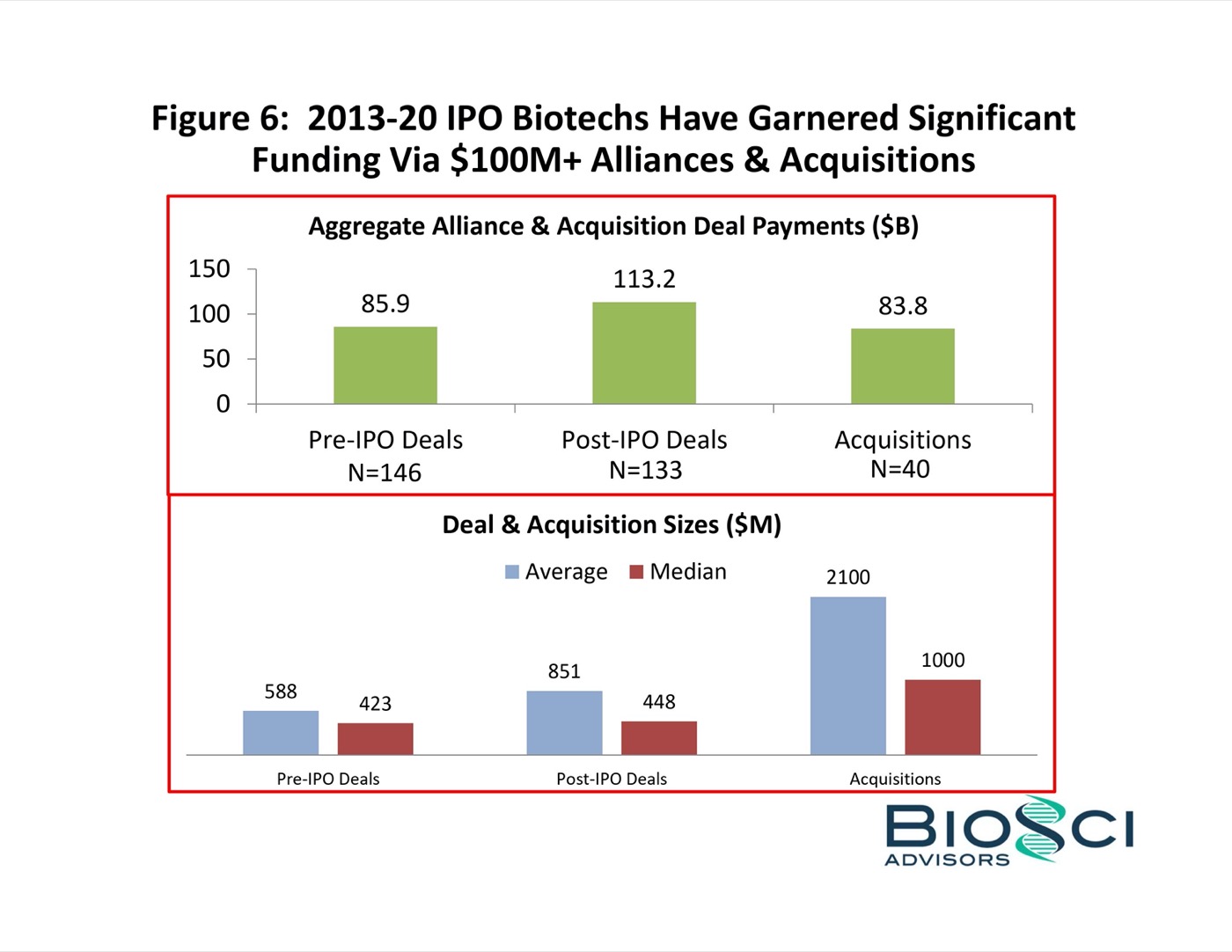 To put the aggregate amounts in context, the aggregate amount of IPO proceeds raised between 2013 and 2020 YTD is $49.4 billion. The $85.9B in aggregate pre-IPO potential alliance payments plus $113.2B such payments for alliances commenced post-IPO are collectively 300% more than all IPO proceeds over the past 7.5 years. Similarly, the $83.8B in acquisition payments for 40 2013-20 IPO Class members represent aggregate cash returns to investors of 70% more than all biotech IPO proceeds since 2013.