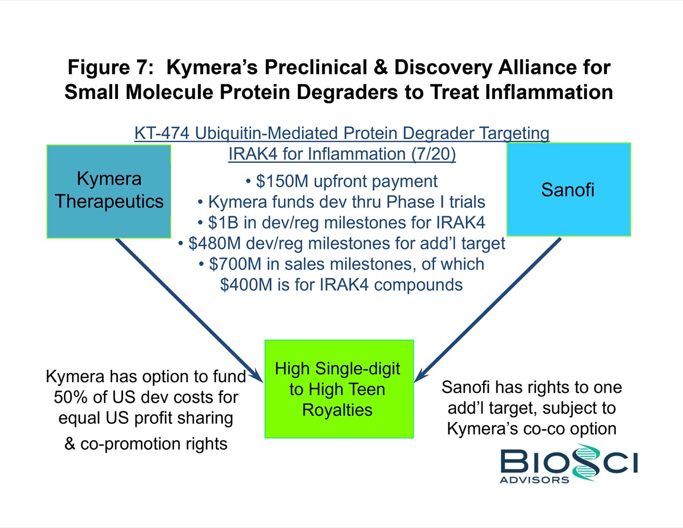 Figure 6 shows the aggregate, average and median deal values of pre-IPO, post-IPO and acquisition deals involving the 2013-20 IPO Class. The individual deals are listed in the Alliances tab of the Biotech IPOs spreadsheet. As an example, Figure 7 is a snapshot of the most recent such alliance – the $2.3 billion pre-IPO deal between Kymera and Sanofi. (We’ve attached deal snapshots for the dozen most recent such pre-IPO alliances here.)