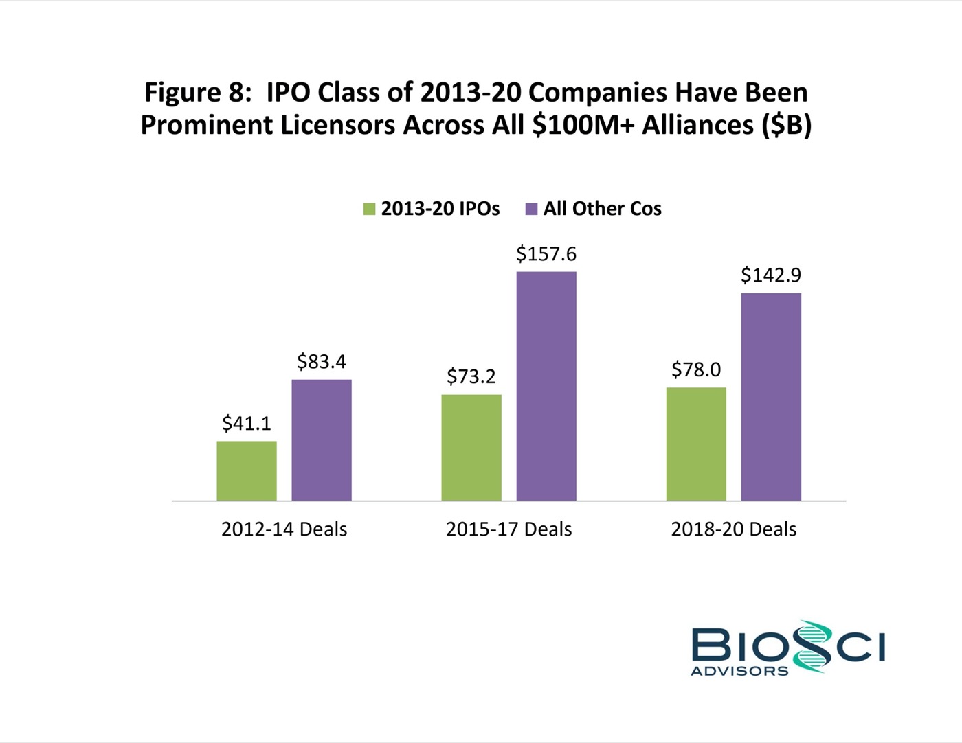 Finally, as confirmation of the contribution of $100M+ alliances to the sustained longevity of the biotech IPO window, we looked at the 2013-20 IPO Class versus all other biotech companies’ presence as licensors in $100M+ alliances over the past nine years. As shown in Figure 8, 2013-20 IPO Class companies have garnered roughly one-third of all potential alliance payments in major alliances announced within the entire biopharma industry since 2012.