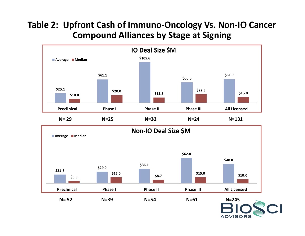 With respect to Upfront Cash at signing, Table 2 shows that IO Alliances obtained higher payments across all stages of development on both an average and median basis. IO Alliances signed at Phase II again registered the largest difference, with Upfront Cash averaging almost triple the amount for IO Alliances versus Non-IO Alliances.