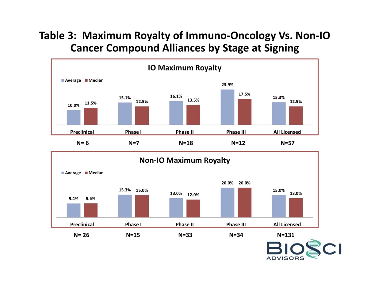 For each of the principal financial terms, only the non-zero values are included in the average and median calculations in the tables and spreadsheet summaries. For example, of the 49 IO Alliances signed at preclinical stage of development, we know the Deal Size for 33, the Upfront Cash for 29 and the Maximum Royalty rate for 6 alliances.