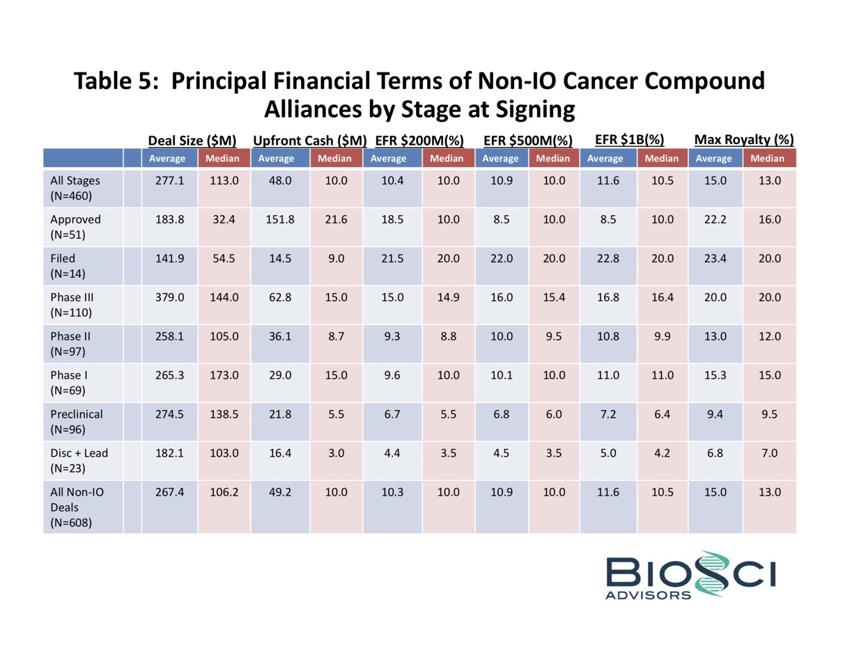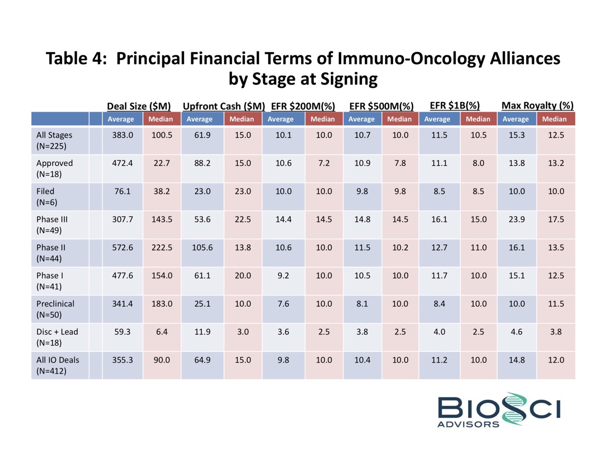For each of the IO Alliances and Non-IO Alliances, we analyzed the financial terms to the extent publicly available, and we’ve summarized the average and median values, by stage at signing, for the principal financial terms. The detailed spreadsheets for the IO Alliances are here, and for the Non-IO Alliances are here.