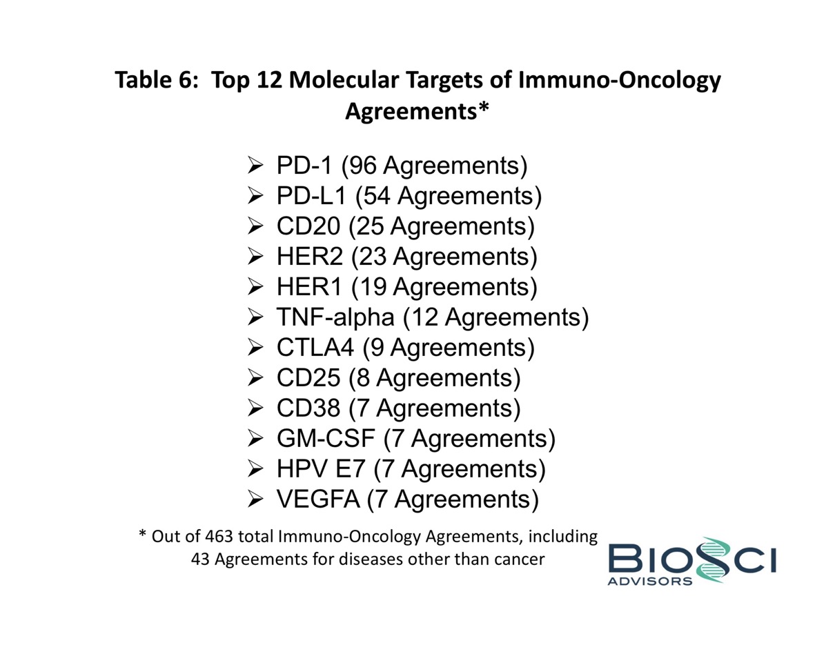 Table 6 identifies the 12 most frequent molecular targets of all 463 agreements in BiosciDB.com directed to immuno-oncology targets. Unsurprisingly, PD-1 and PL-L1 are the most common IO targets, followed by CD20, HER2, HER1 and TNF-alpha for the top six slots. The remaining six are roughly in parity with each other. The spreadsheet of molecular targets for all 463 immuno-oncology agreements is available here.