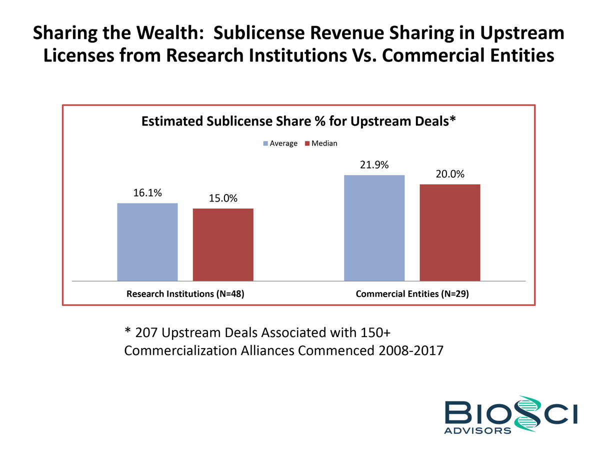 By contrast, 94 upstream deals (45%) involved commercial entities as the upstream licensor. For 29 of these upstream deals, we know (or could estimate based on the timing and/or stage of the associated commercialization deal) the Sublicense Share %. These upstream deals involving commercial entities had a median Estimated Share of 20%, and an average share of 21.9%.