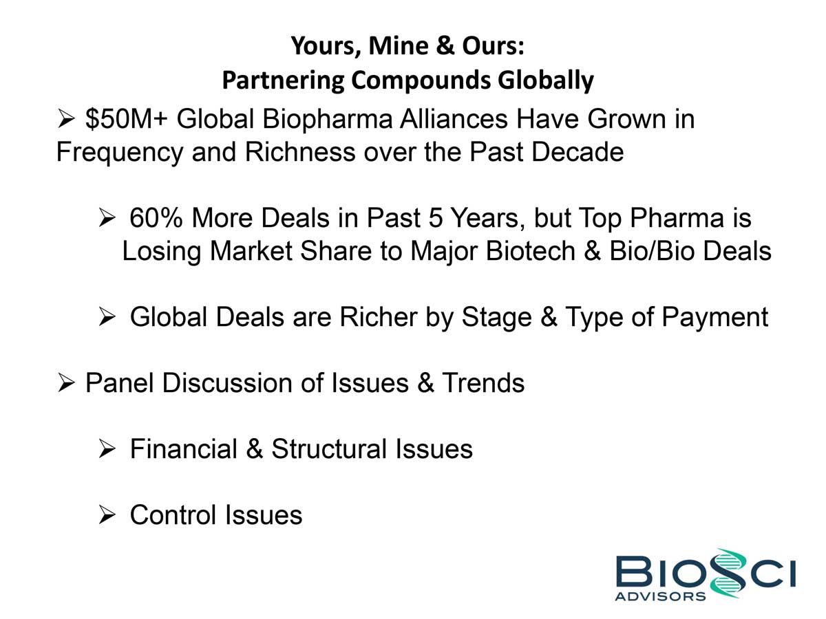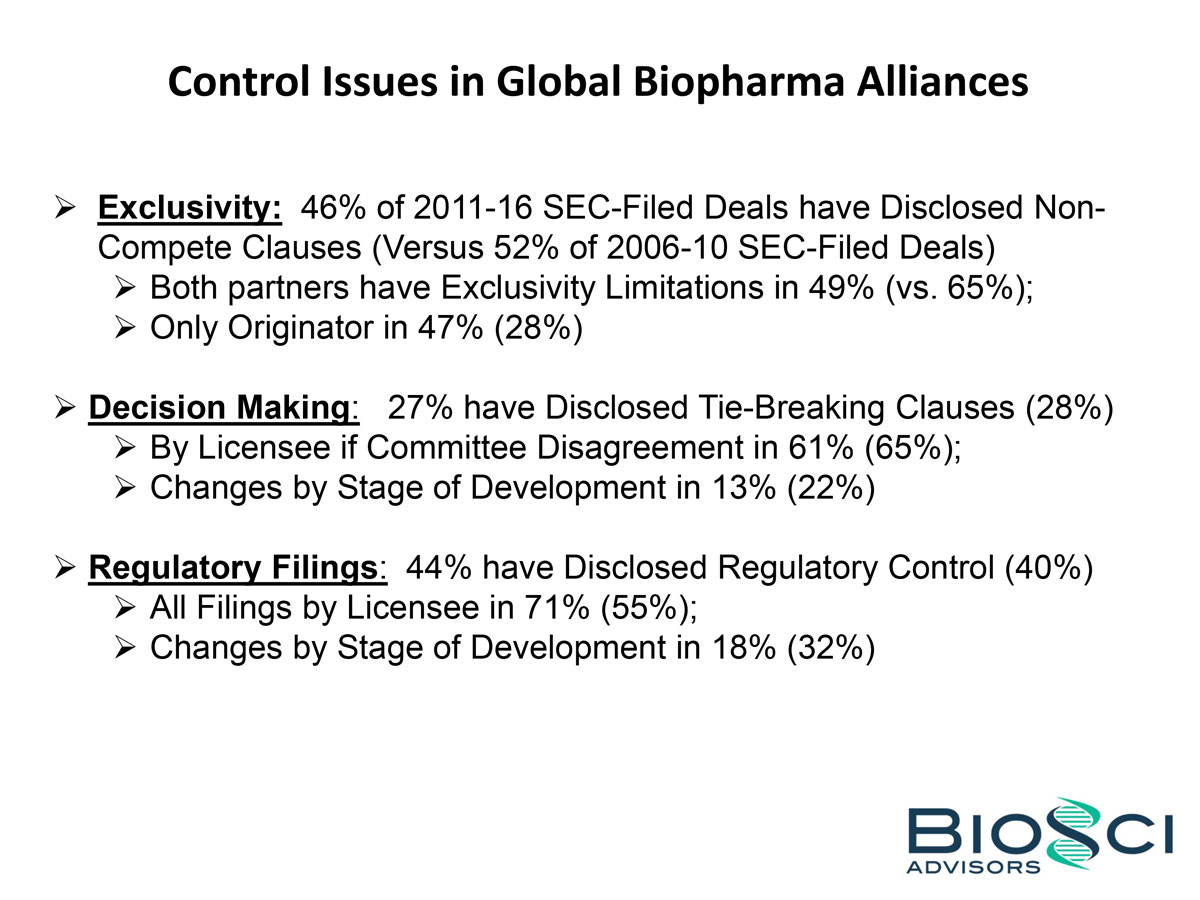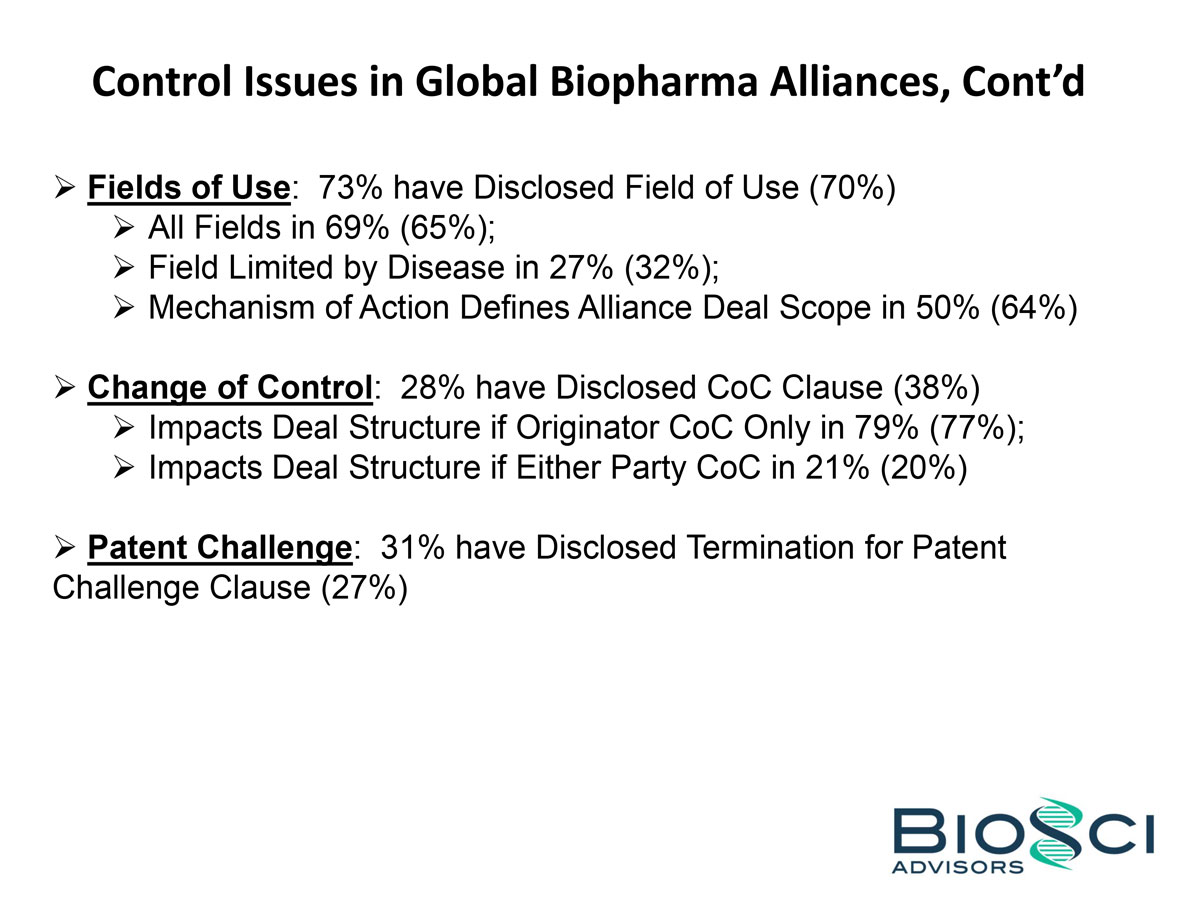 This analysis has shown recent global biopharma alliances have grown in frequency and changed in structure over the past 5+ years. Commitment to co-development has declined, while optionality has increased. Control provisions continue largely to favor licensees over originators.