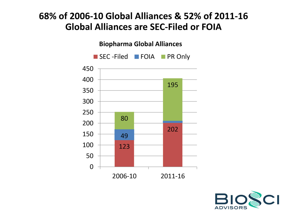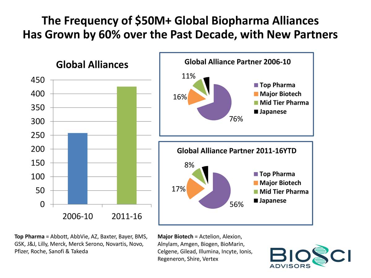 After the end of the genomics-led technology platform era in 2000, many biopharma alliances went global of necessity, as funding constraints largely forced biotechs to curtail their ambitions to become independent developers and marketers of compounds in home territories. More recently, however, the advent of powerful technological platforms, including immuno-oncology, cell and gene therapy, as well as receptive capital markets, have opened the doors to new alliance strategies. For this reason, BioSci has undertaken a comparative analysis of global biopharma alliances over the past decade – to see how global deals signed from 2006-10 stack up against alliances commenced within the past 5+ years.