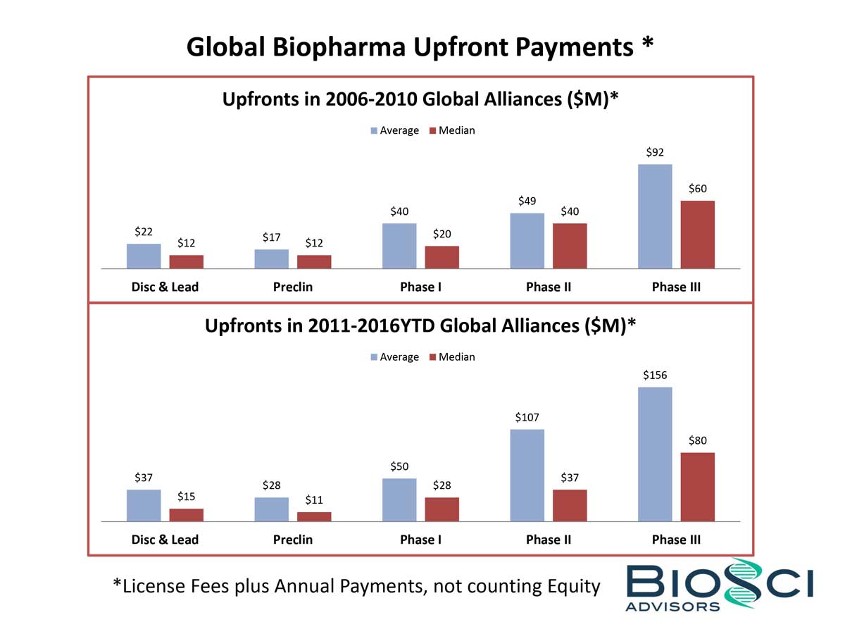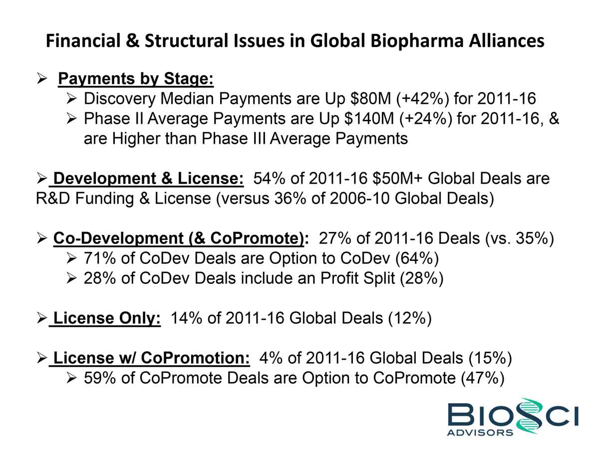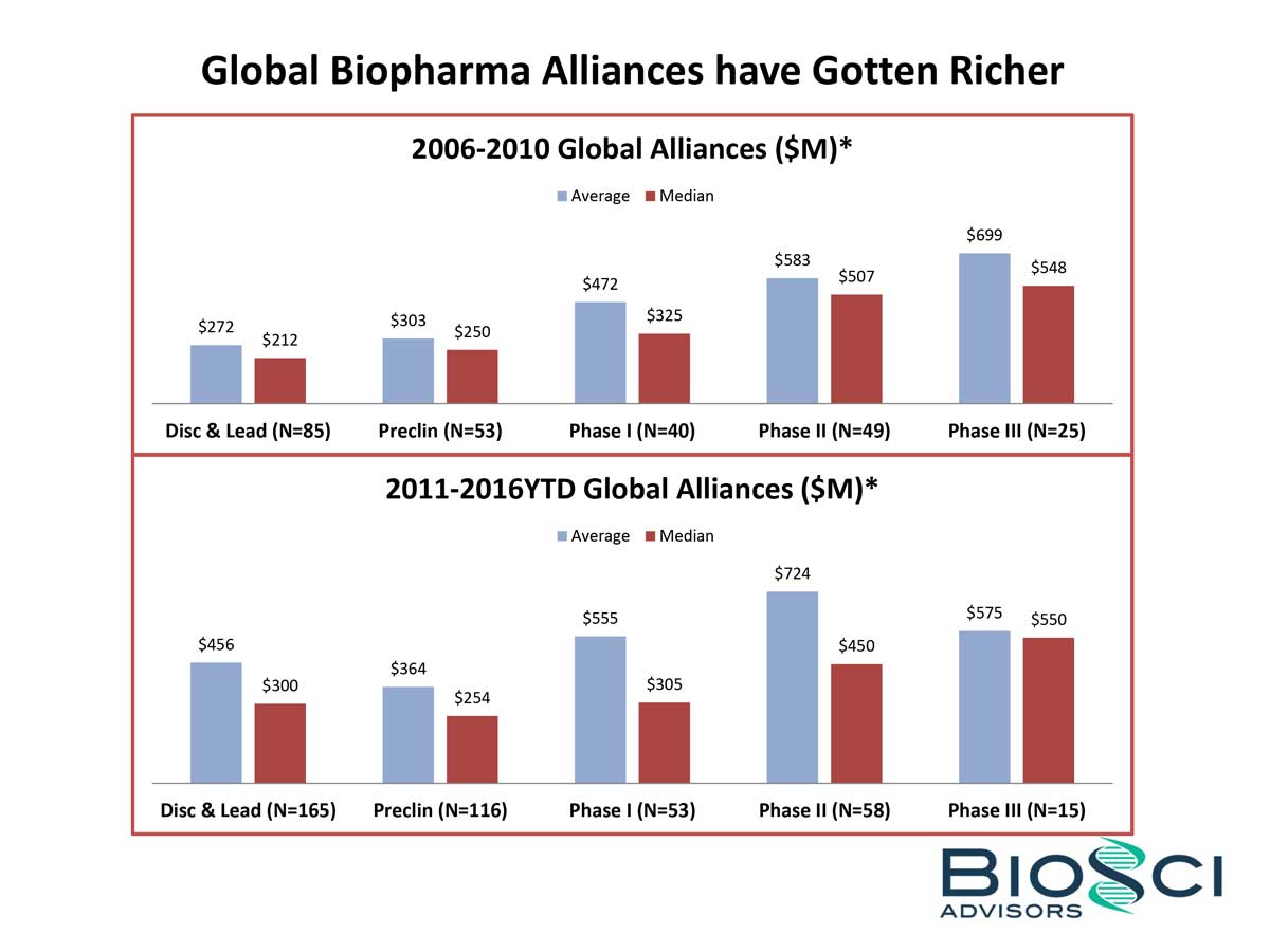 As shown in slides 4-8, the payment terms for Discovery/Lead stage and Phase II stage global biopharma alliances have increased, on both an average and median basis, over the past 5+ years. Average payment terms have also increased across all other stages of development except Phase III deals, whereas median payments have remained similar for alliances across all other stages over time. Specific deal terms by stage, payment type and alliance partners are included in the attached financial spreadsheets.