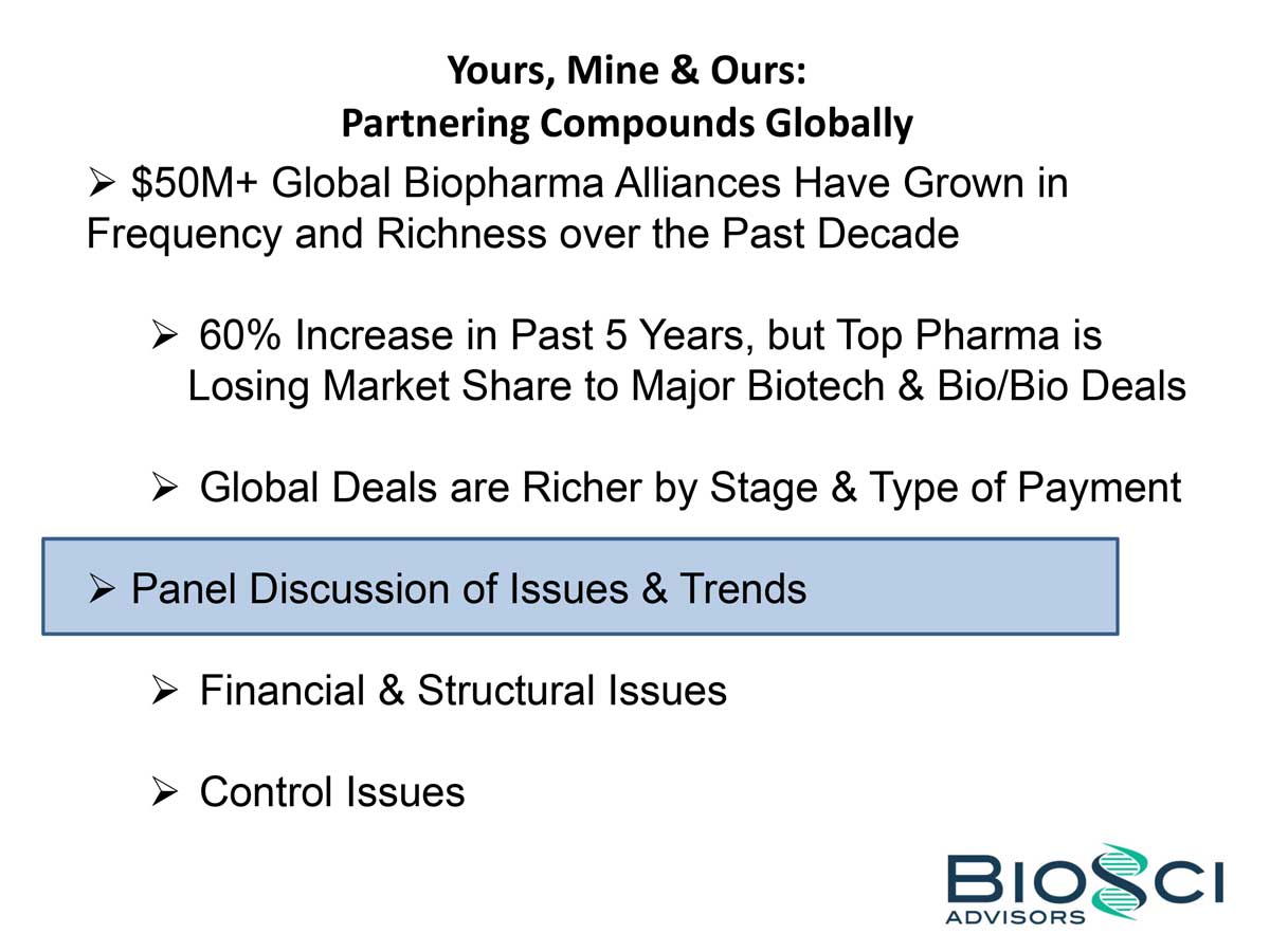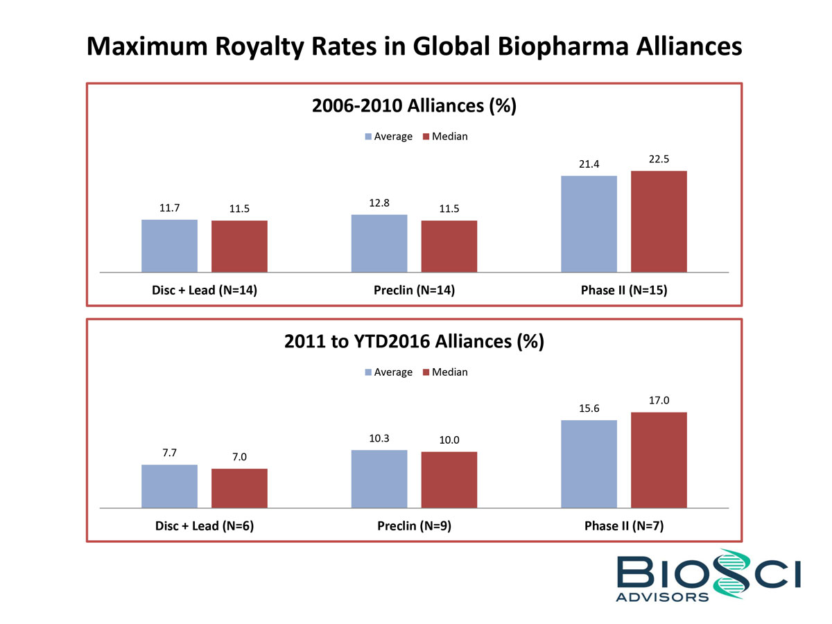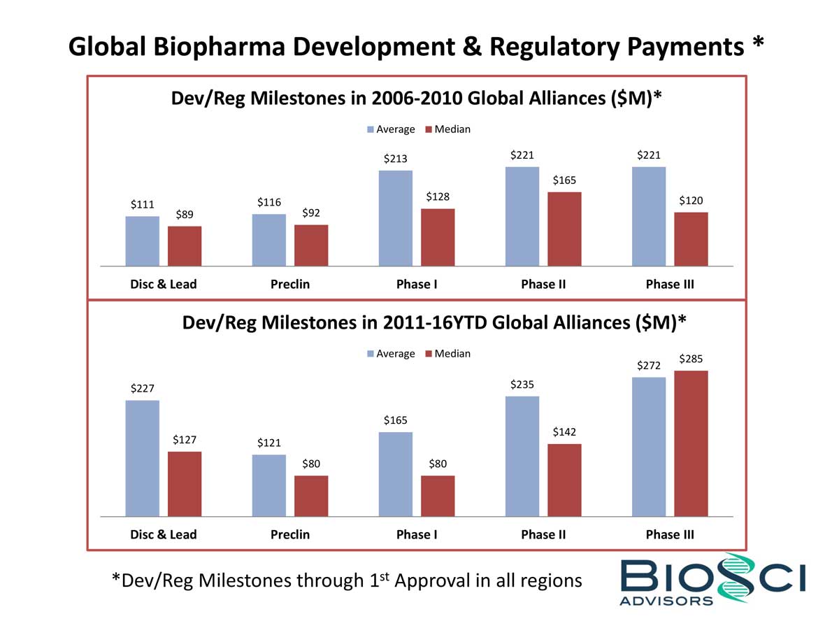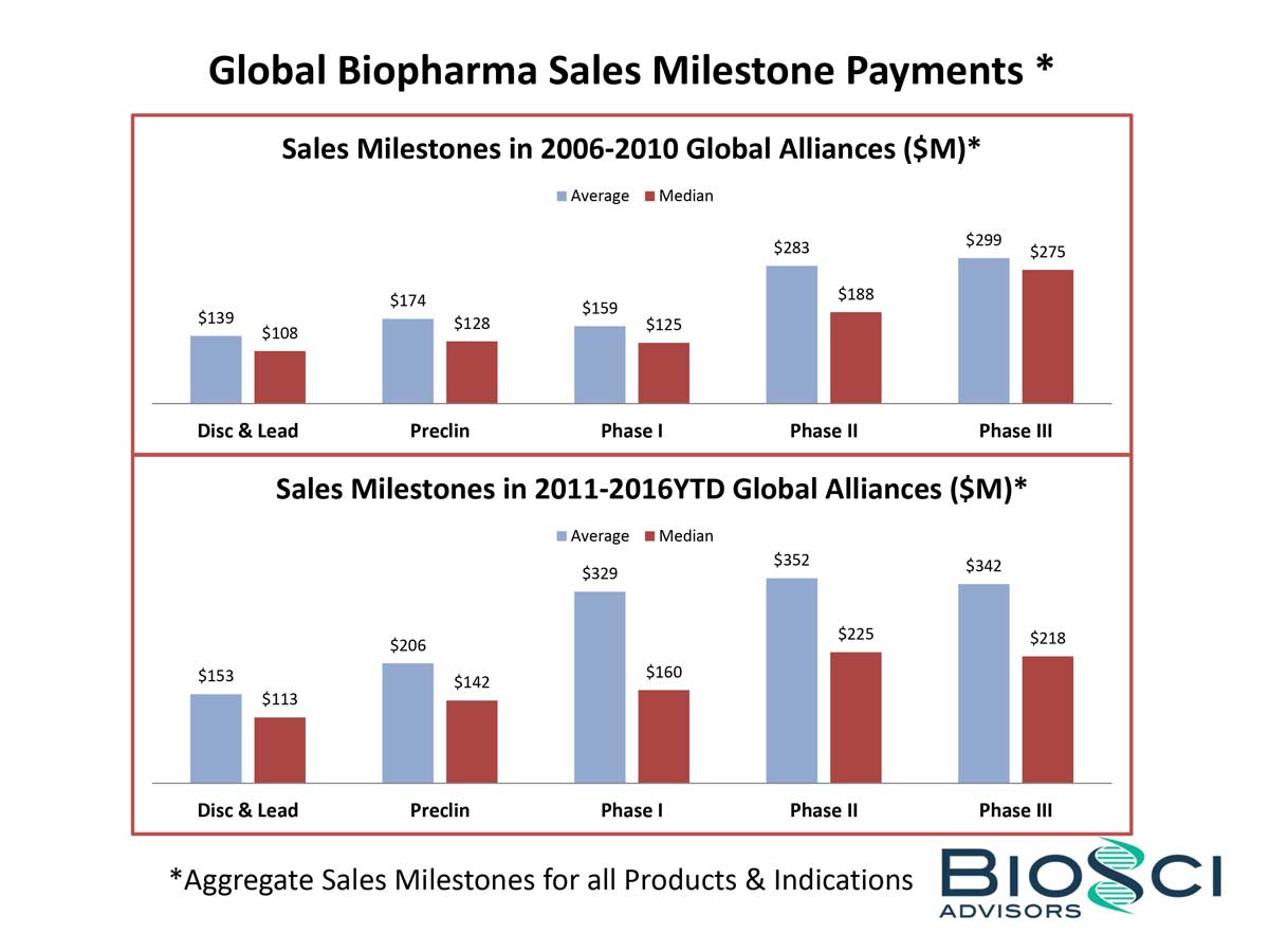 As shown in slides 4-8, the payment terms for Discovery/Lead stage and Phase II stage global biopharma alliances have increased, on both an average and median basis, over the past 5+ years. Average payment terms have also increased across all other stages of development except Phase III deals, whereas median payments have remained similar for alliances across all other stages over time. Specific deal terms by stage, payment type and alliance partners are included in the attached financial spreadsheets.