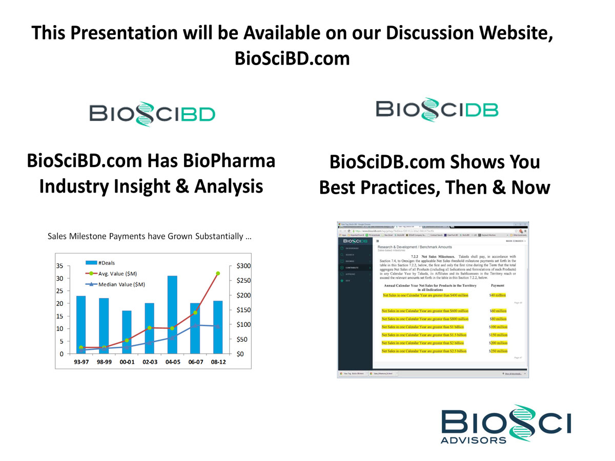 N.B. With respect to the average and median amounts shown in the slides and tables, the Deal Size doesn’t closely correlate to the sum of the Upfront, Dev/Reg and Sales amounts for two reasons: (1) the Deal Size may include additional payment elements, such as sponsored R&D, equity, loans and/or milestones for additional products and/or indications; and (2) the average and median amounts for Upfront, Dev/Reg and Sales payments apply only to deals for which these amounts were known.